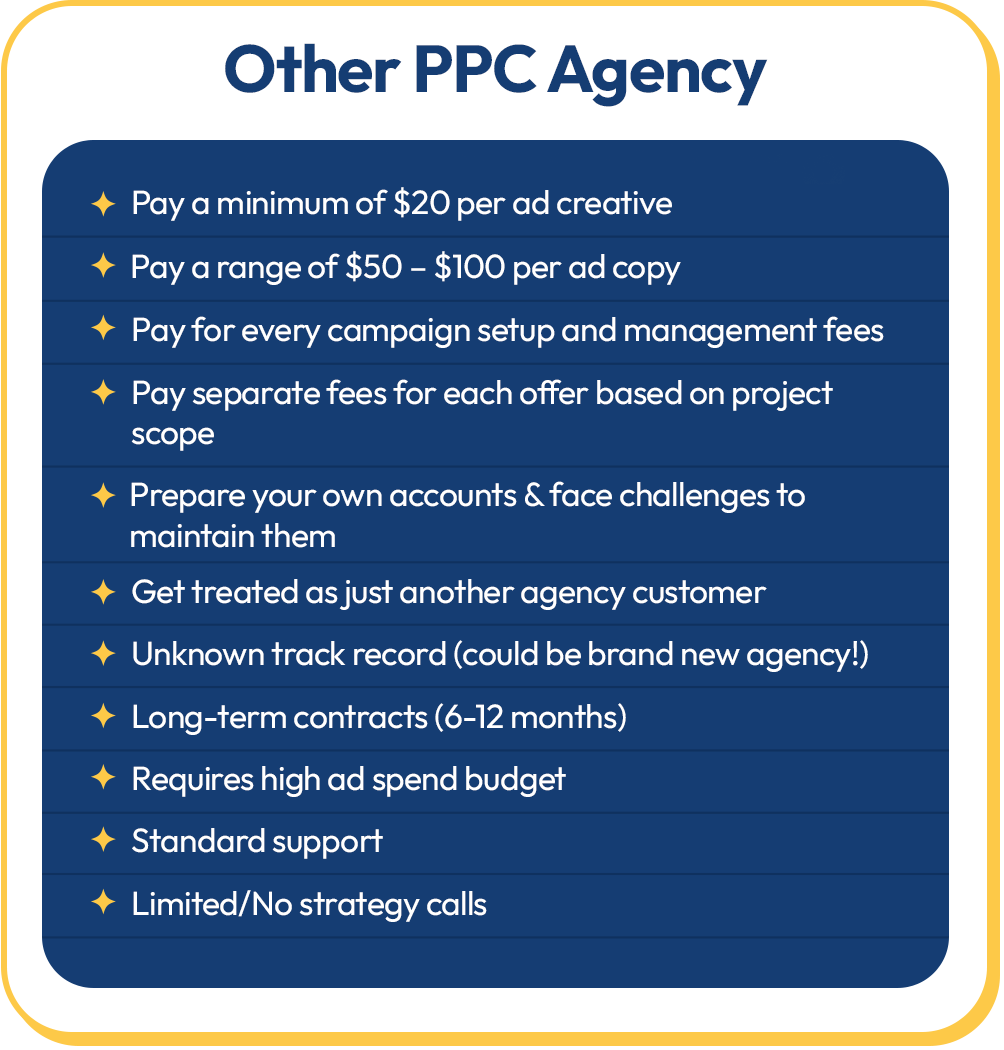 No, UnlimitedPPC is not designed for marketing agencies or third-party service providers. Our service is tailored specifically for individual businesses that want to run and manage their own paid advertising campaigns. We focus on providing comprehensive campaign creation and management to help business owners grow their brand and achieve their marketing goals. If you represent an agency looking to manage ads for multiple clients, unfortunately, this service is not a fit for that purpose.
